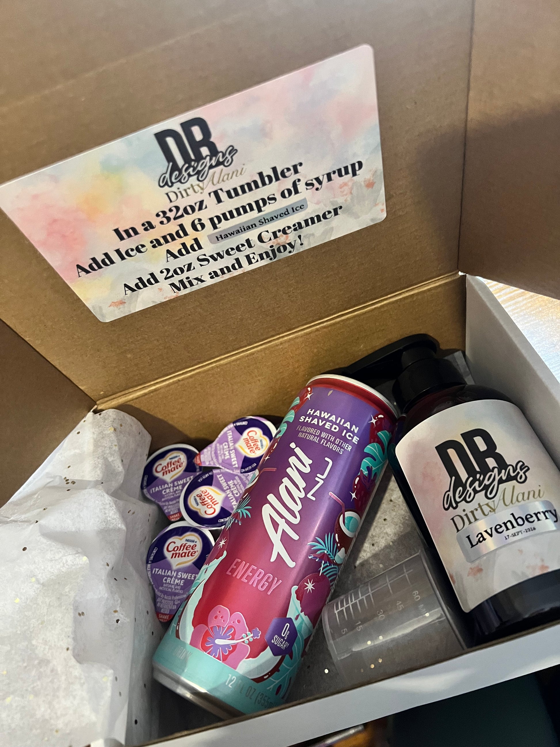 Make your very own dirty Alani at home! In your box you’ll get everything you need to start. Right out of the box you will be able to mix up your first drink. After that, shop the list and make 9 more before having to order another box!!